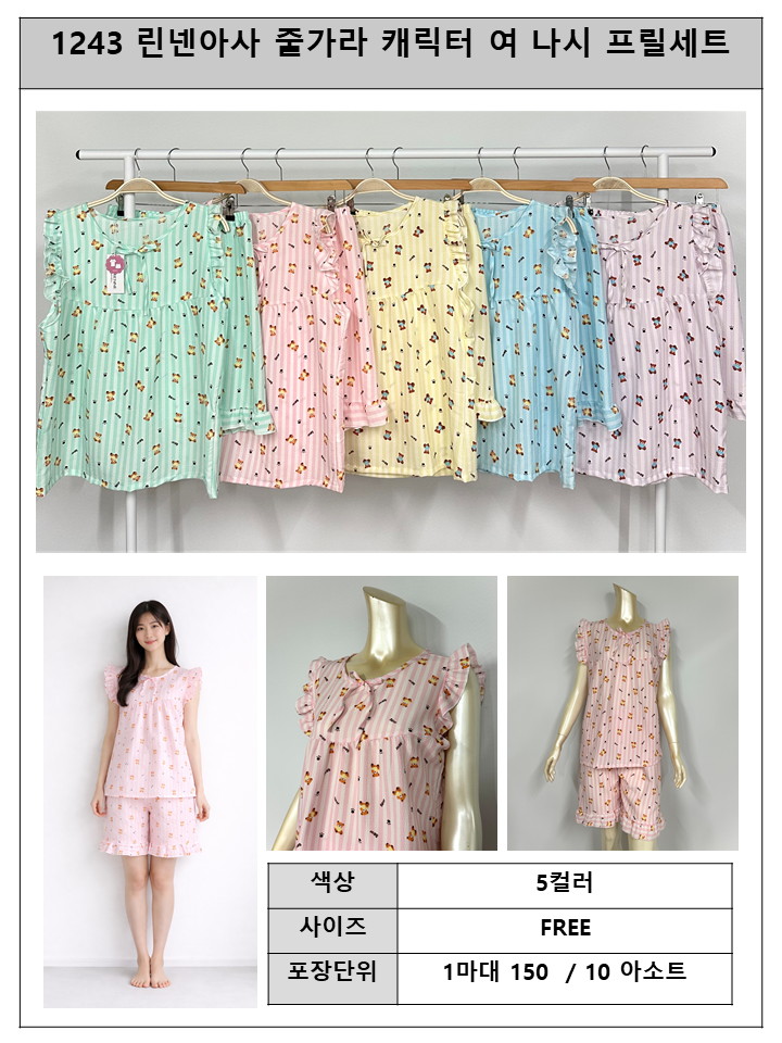 S1243 린넨아사)줄가라캐릭터 나시프릴여세트